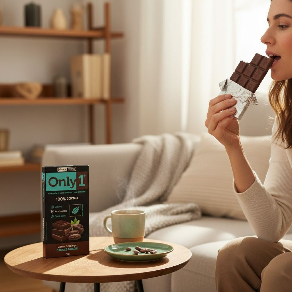 Experimente o sabor autêntico e os benefícios do CHOCOLATE 100% CACAU ONLY1 da Only4, perfeito para quem busca uma opção saudável e intensa.