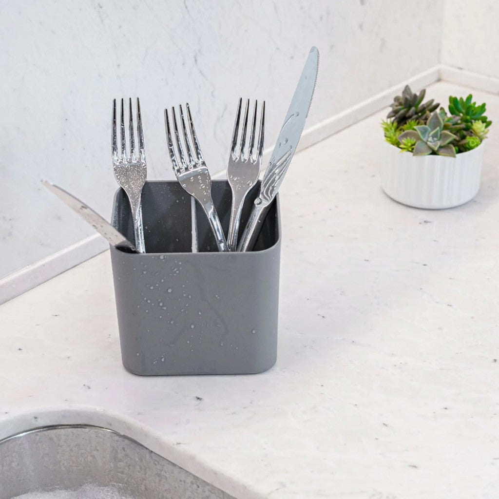 Com um design minimalista e elegante, este escorredor de talheres otimiza o espaço sobre a pia, garantindo uma organização versátil e eficiente.
