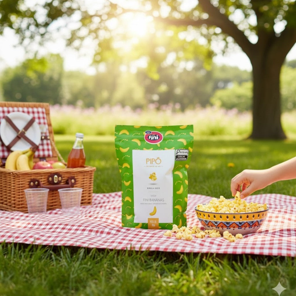 Experimente a explosão de sabor da Pipoca Doce Pipó com o inconfundível toque das Fini Bananas, um snack crocante e divertido de 80g.