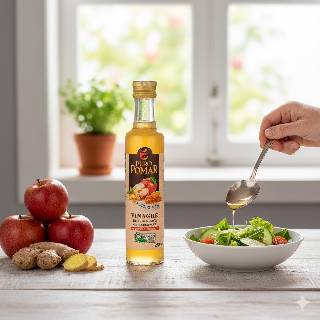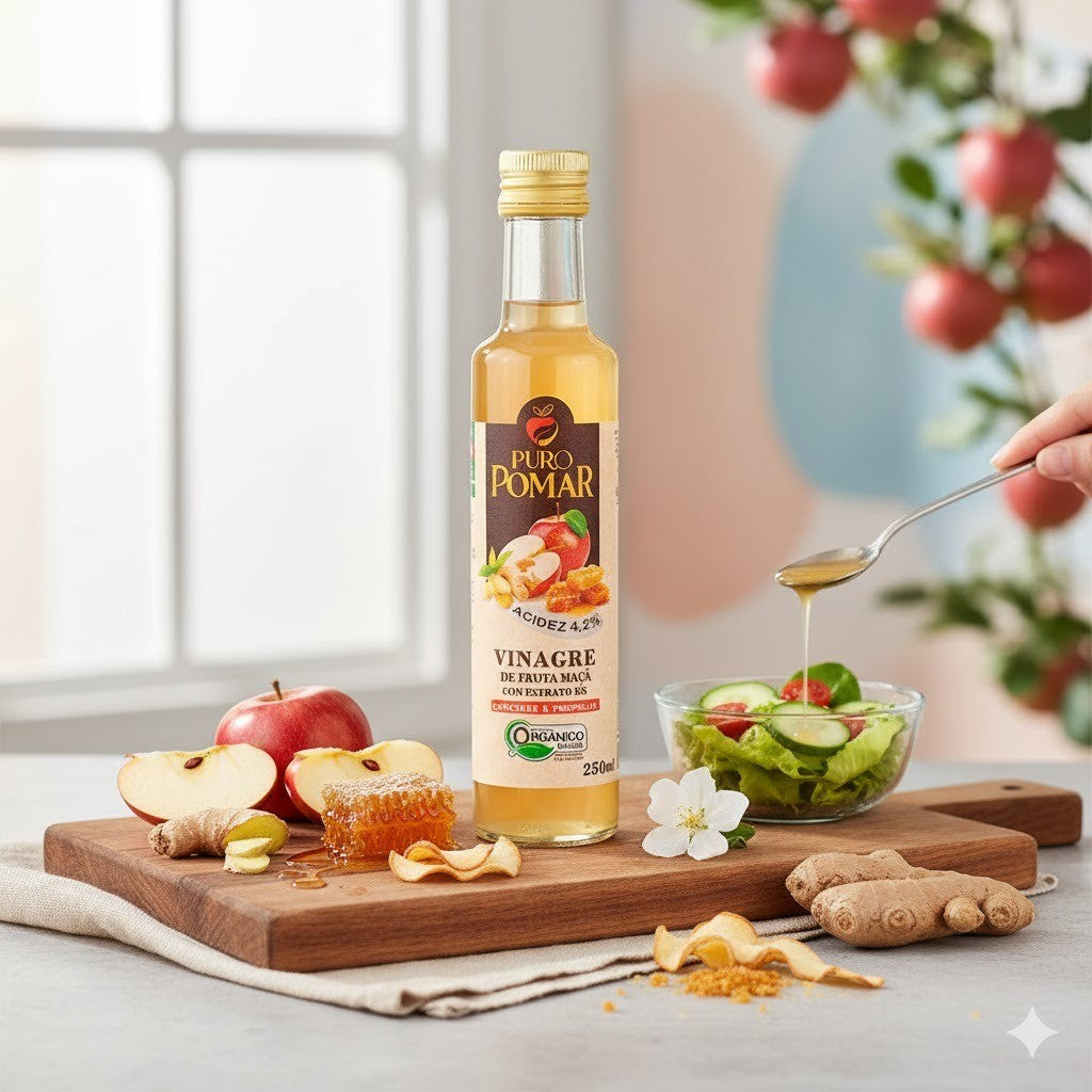O Vinagre de Maçã Puro Pomar com extrato de gengibre e própolis oferece uma combinação saudável e natural para o seu bem-estar diário.
