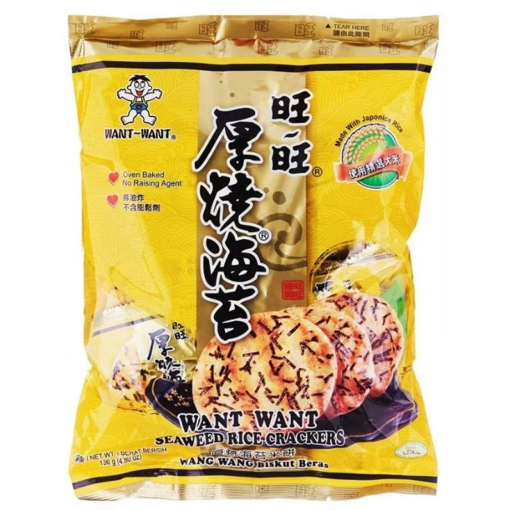 Biscoito de Arroz Salgado com Nori 136g da marca Want Want é um biscoito de arroz crocante, levemente salgado, temperado com shoyu e pedaços de alga.