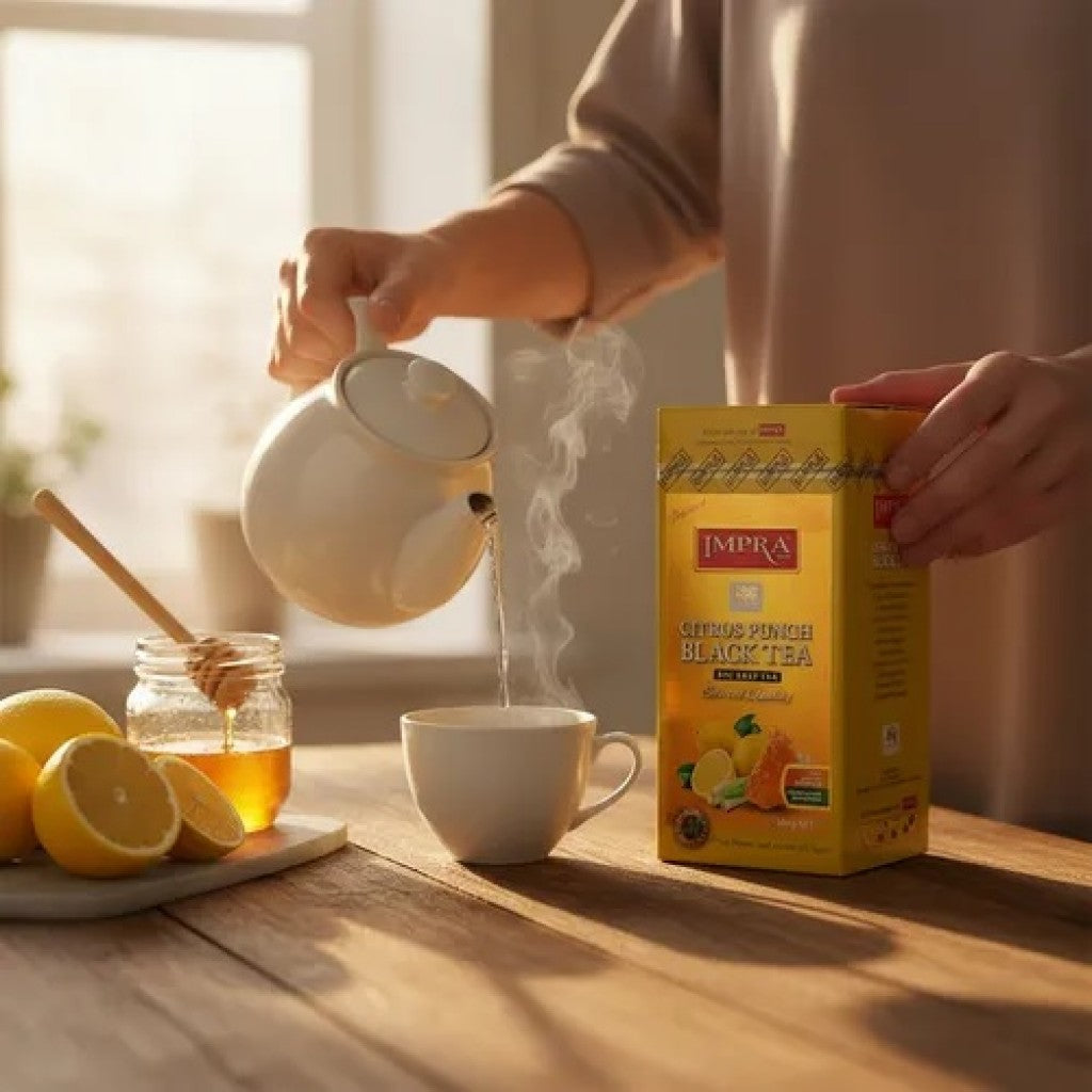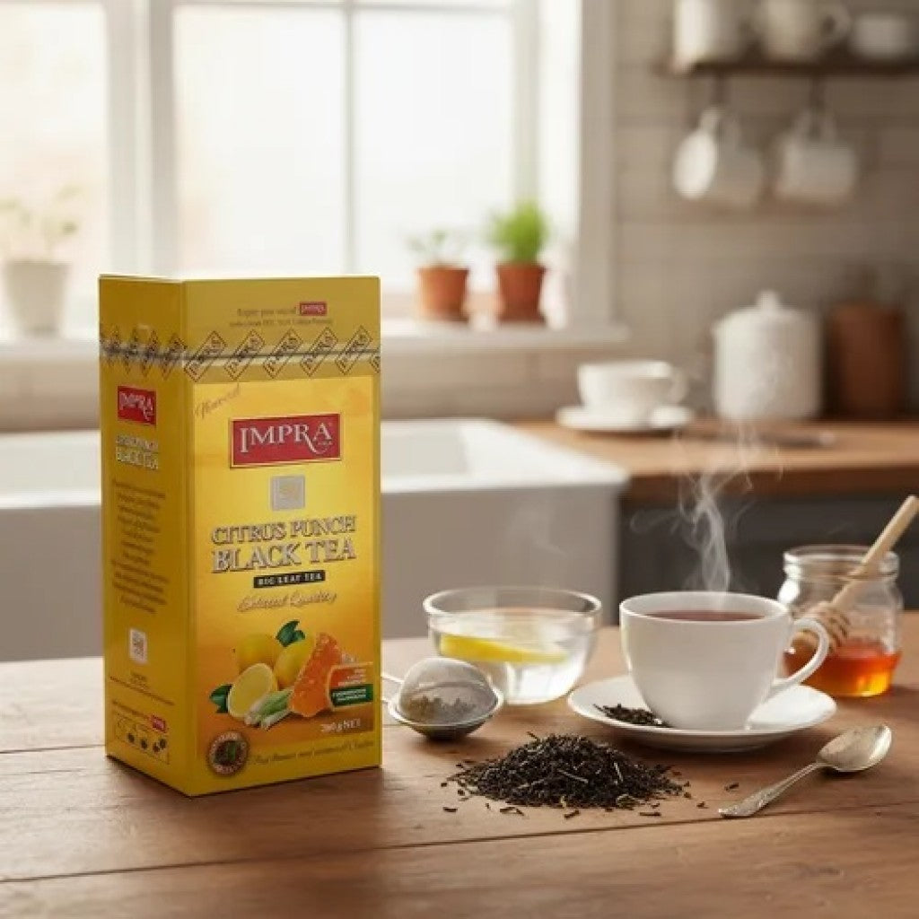 Desfrute do sabor exótico e refrescante do Chá Preto Frutas Cítricas com Especiarias IMPRA, uma bebida revigorante para qualquer hora do dia.