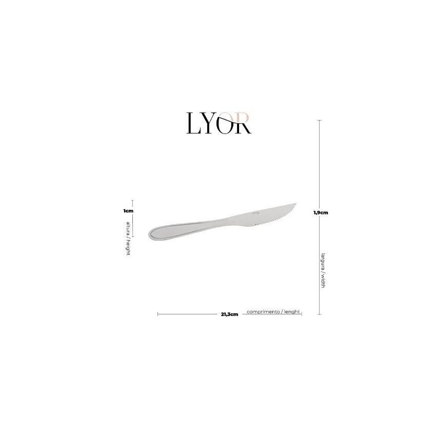 Sofisticação e qualidade para suas refeições O Conjunto de 6 Facas para Mesa de Aço Inox Gastro 21,5cm da marca Lyor é a escolha perfeita para quem busca sofisticação e qualidade em seus utensílios de mesa. Com lâminas em aço inox, essas facas proporcionam durabilidade e precisão no corte de diversos alimentos. Fabricadas em aço inox de alta qualidade Design elegante e moderno Conjunto com 6 facas ideais para o uso diário Facas com 21,5cm de comprimento, proporcionando praticidade no manuseio Ideais para cortar carnes, legumes, frutas e outros alimentos Podem ser utilizadas tanto em casa quanto em restaurantes Fáceis de limpar e manter Para garantir a durabilidade das facas, recomenda-se lavá-las À mão com água e sabão neutro, secando-as completamente antes de guardar. Evite o uso de materiais abrasivos que possam danificar o aço inox. Marca: Lyor Material: Aço Inox Quantidade: 6 facas Comprimento: 21,5cm Categoria: Faqueiro e TalheresConjunto de 6 Facas para Mesa de Aço Inox Gastro 21,5cm - Lyor