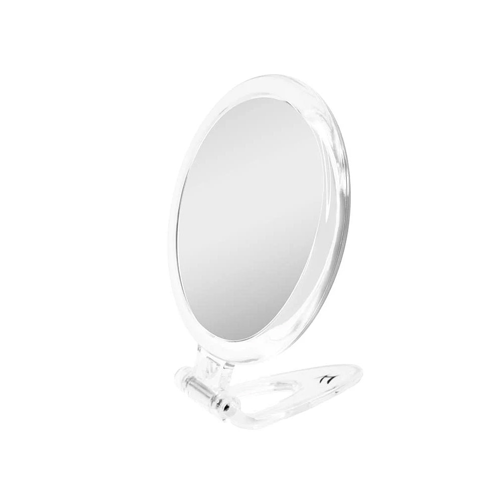 Este espelho possui duas faces e um suporte para seu conforto. Um dos lados possui reflexo convencional e o outro lado apresenta um aumento de 20X.