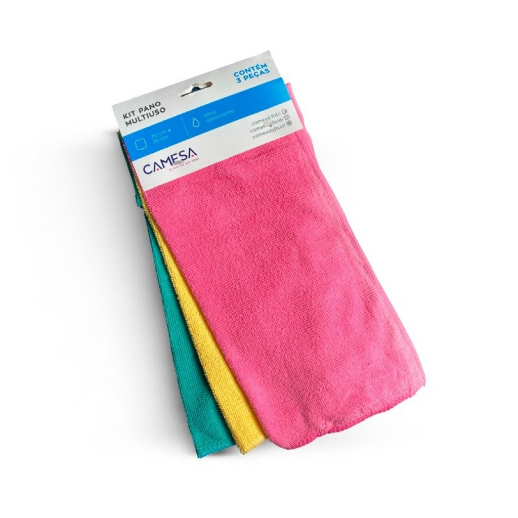 O KIT PANO MULTIUSO LISO 3 PCS 30CMX30CM SORTIDO CAMESA oferece a praticidade e a eficiência da microfibra para uma limpeza completa em diversas superfícies.
