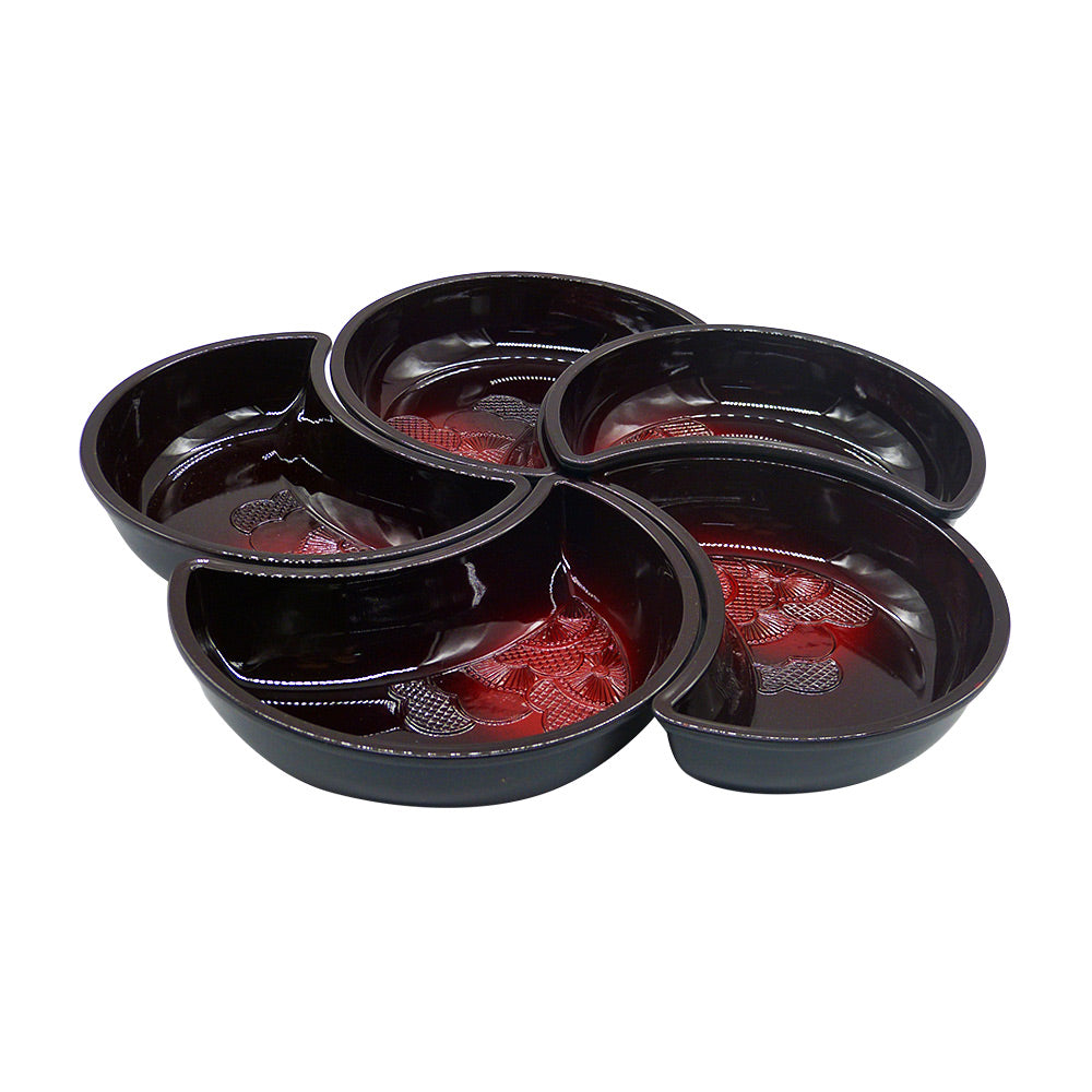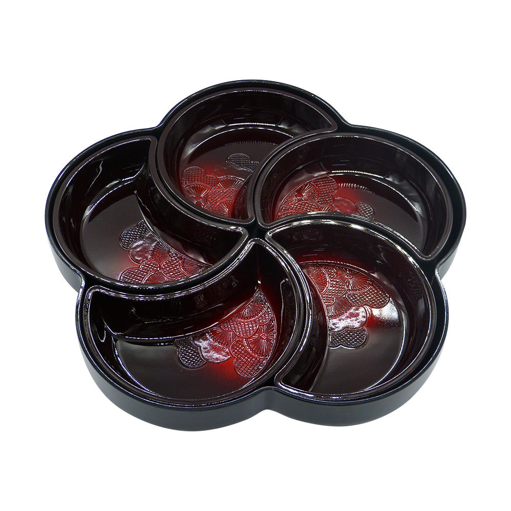 No formato de flor, giratória, confeccionada no estilo oriental e com divisórias removíveis, essa petisqueira além de requintada é muito útil na reunião entre amigos e familiares.